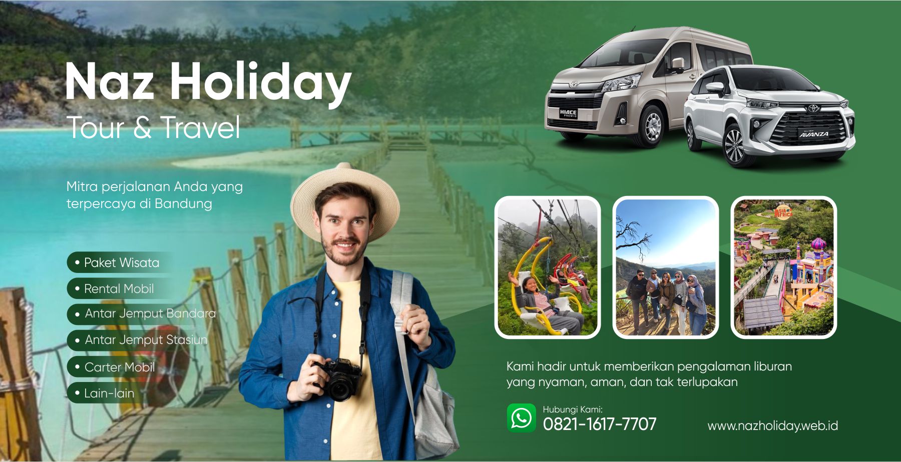 Naz Holiday Tour Travel adalah penyedia layanan tour & travel profesional yang berbasis di Kota Bandung. Kami berdedikasi untuk memberikan pengalaman perjalanan yang aman, nyaman, dan penuh kenangan bagi setiap pelanggan, baik individu, keluarga, rombongan, maupun tamu mancanegara.